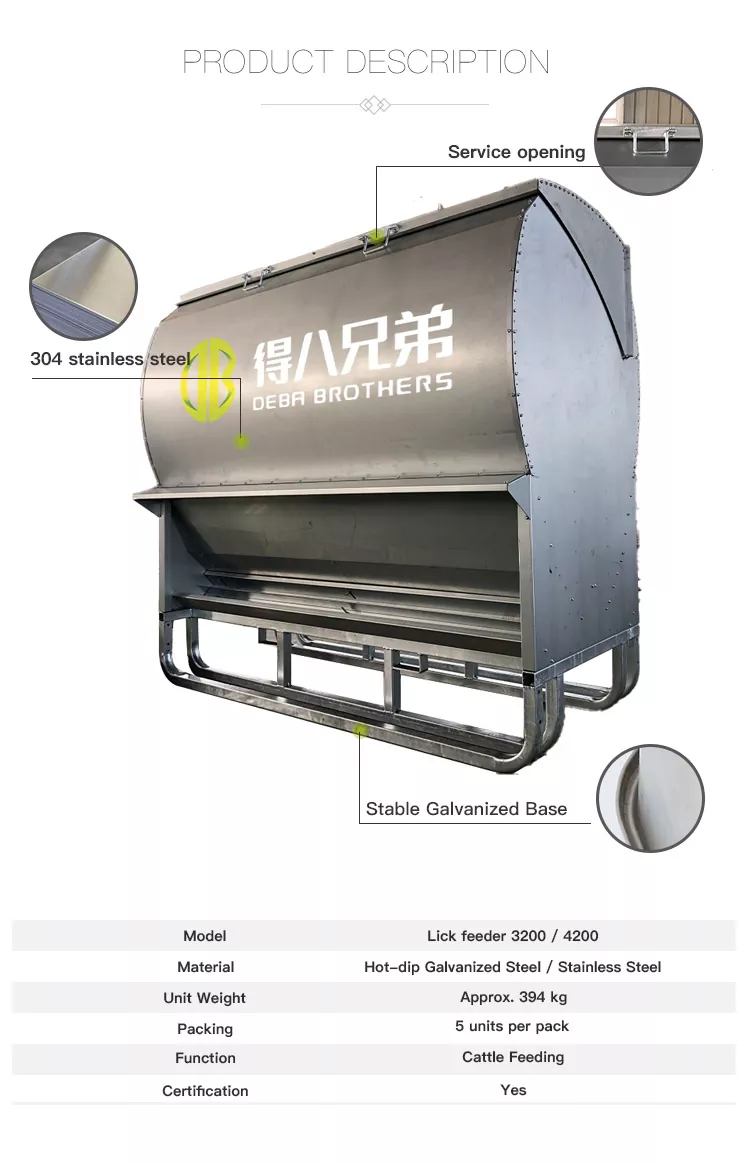 Naše volně přístupné stáje a odolná galvanizovaná krmítka na lízání dobytka se vyznačují uživatelsky příjemným designem, jsou vhodné pro chovy hospodářských zvířat všech velikostí a nabízejí výjimečnou odolnost díky prvotřídním materiálům a jemnému zpracování. Tyto produkty, které jsou dobře přijímány chovateli hospodářských zvířat po celém světě, byly plně ověřeny pro jejich stabilní výkon a vysokou nákladovou efektivitu.