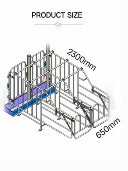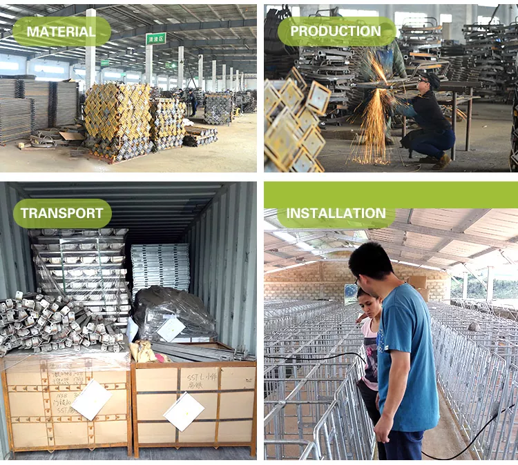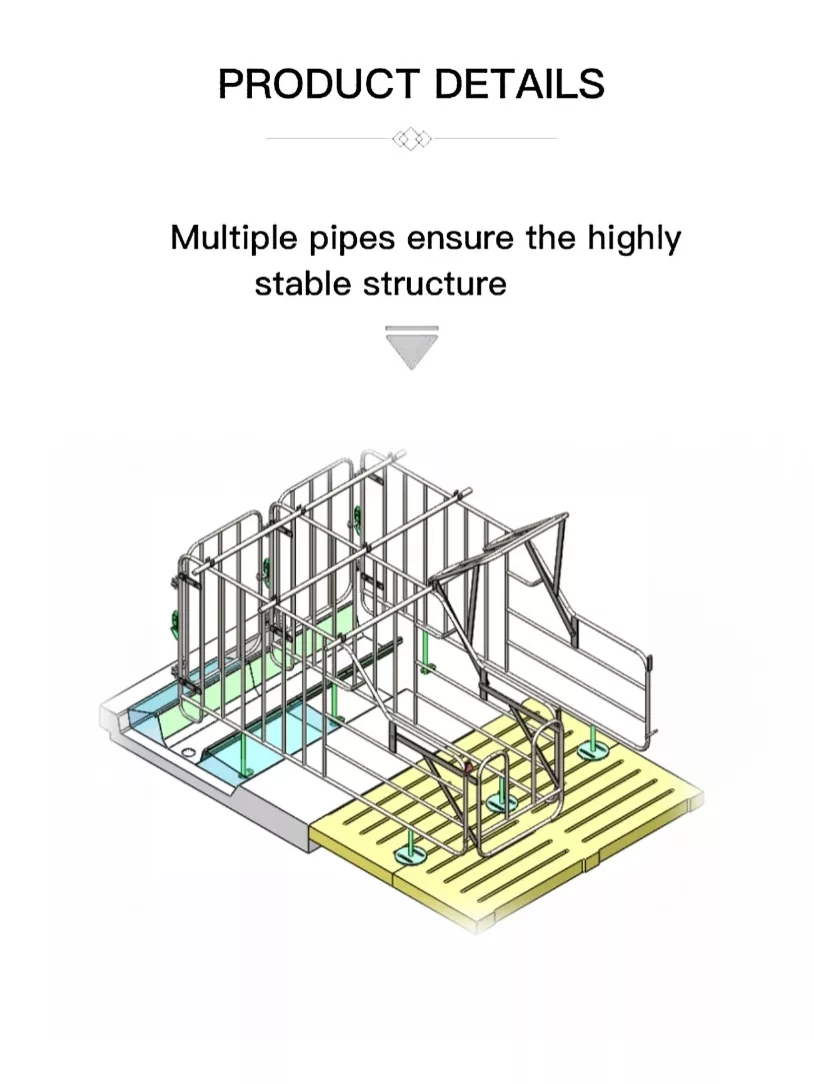 1.Zabezpečte přední zamykací dvířka se spolehlivou západkou zabraňující úniku prasnice, se zaoblenými kovovými hranami, aby se zabránilo zranění zvířat.